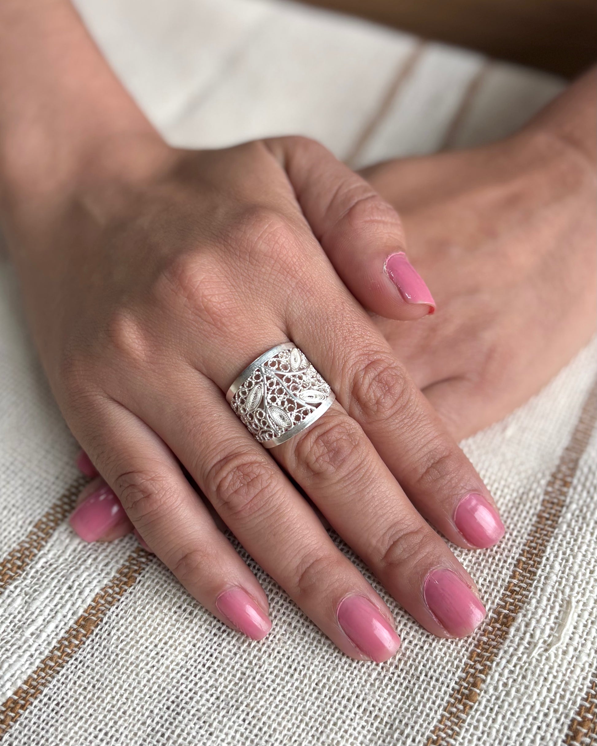 パラグアイの伝統技法「フィリグラーナ」で仕立てた、存在感のあるシルバーリング。