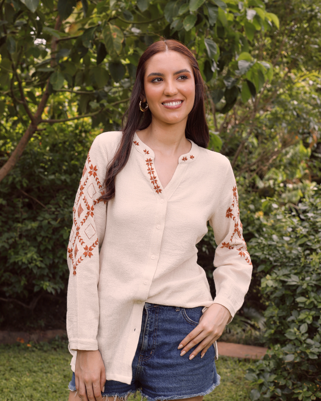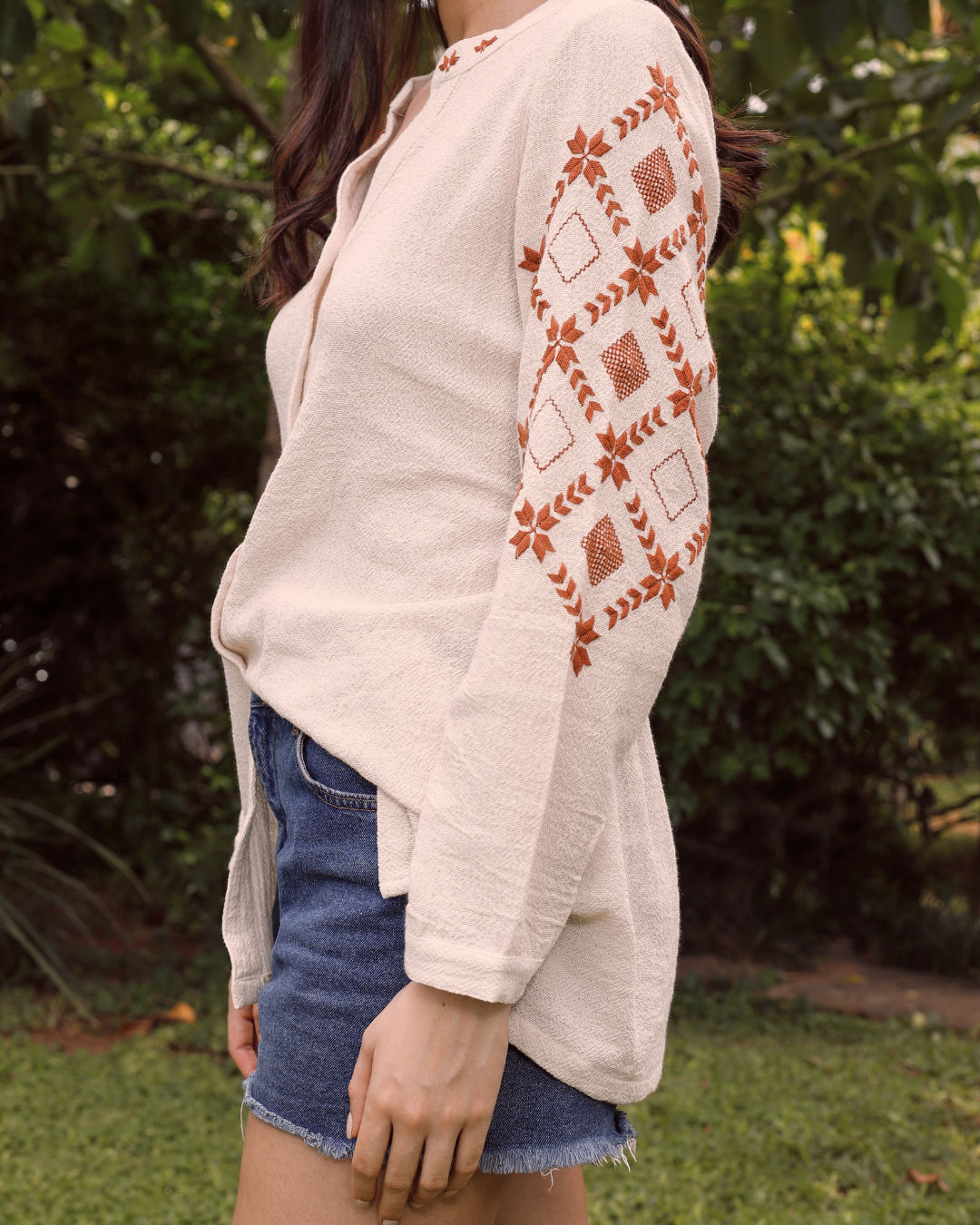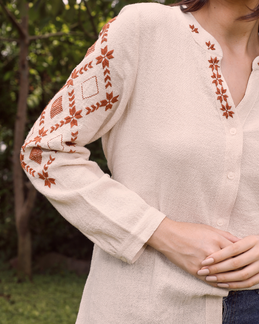 夏場はこれ一枚で、冬はハイネックセーターを合わせて、オールシーズンでお使いいただけます。パラグアイでも人気のアオポイ刺繍のアパレルブランドのカットソーです。