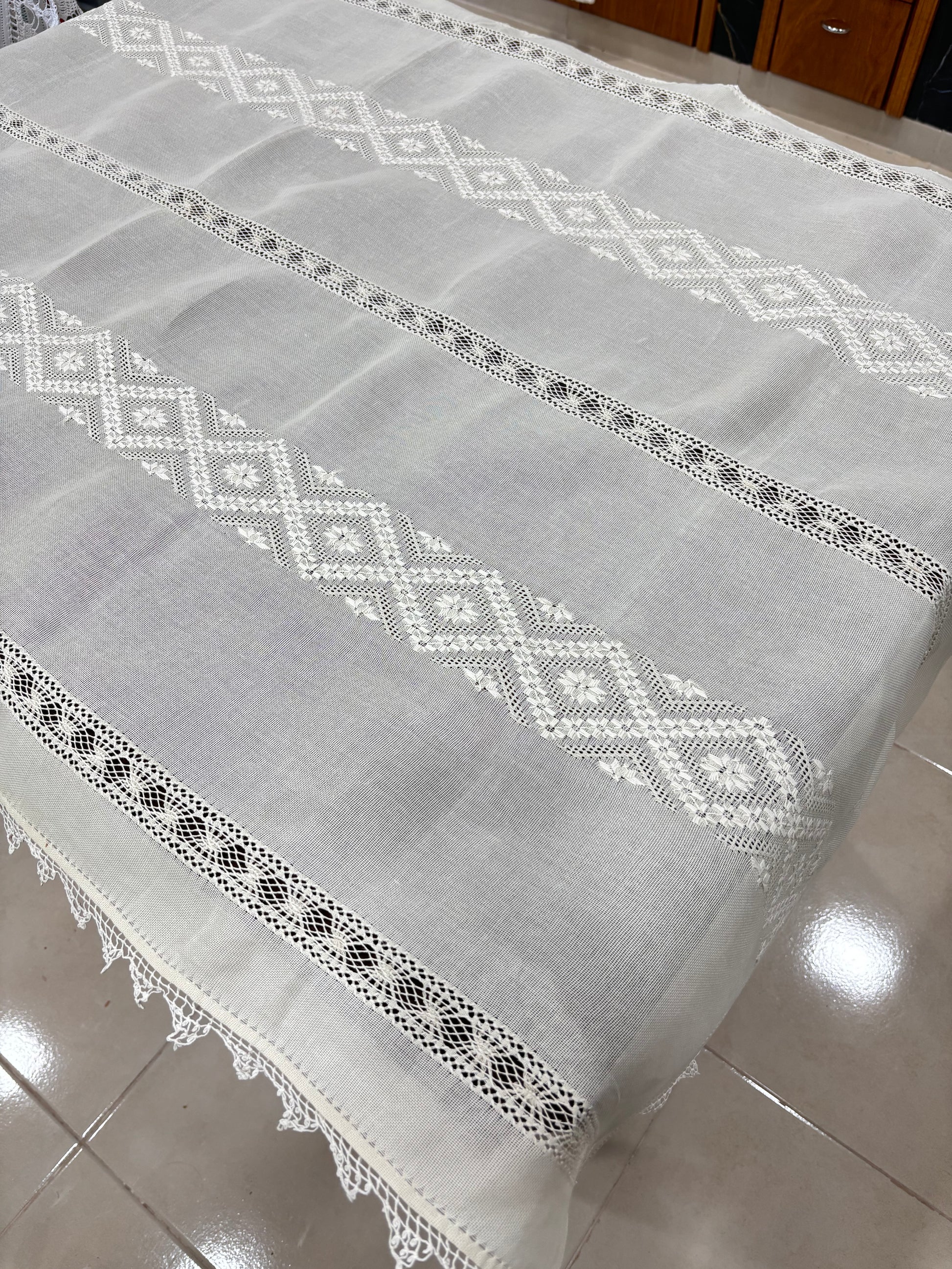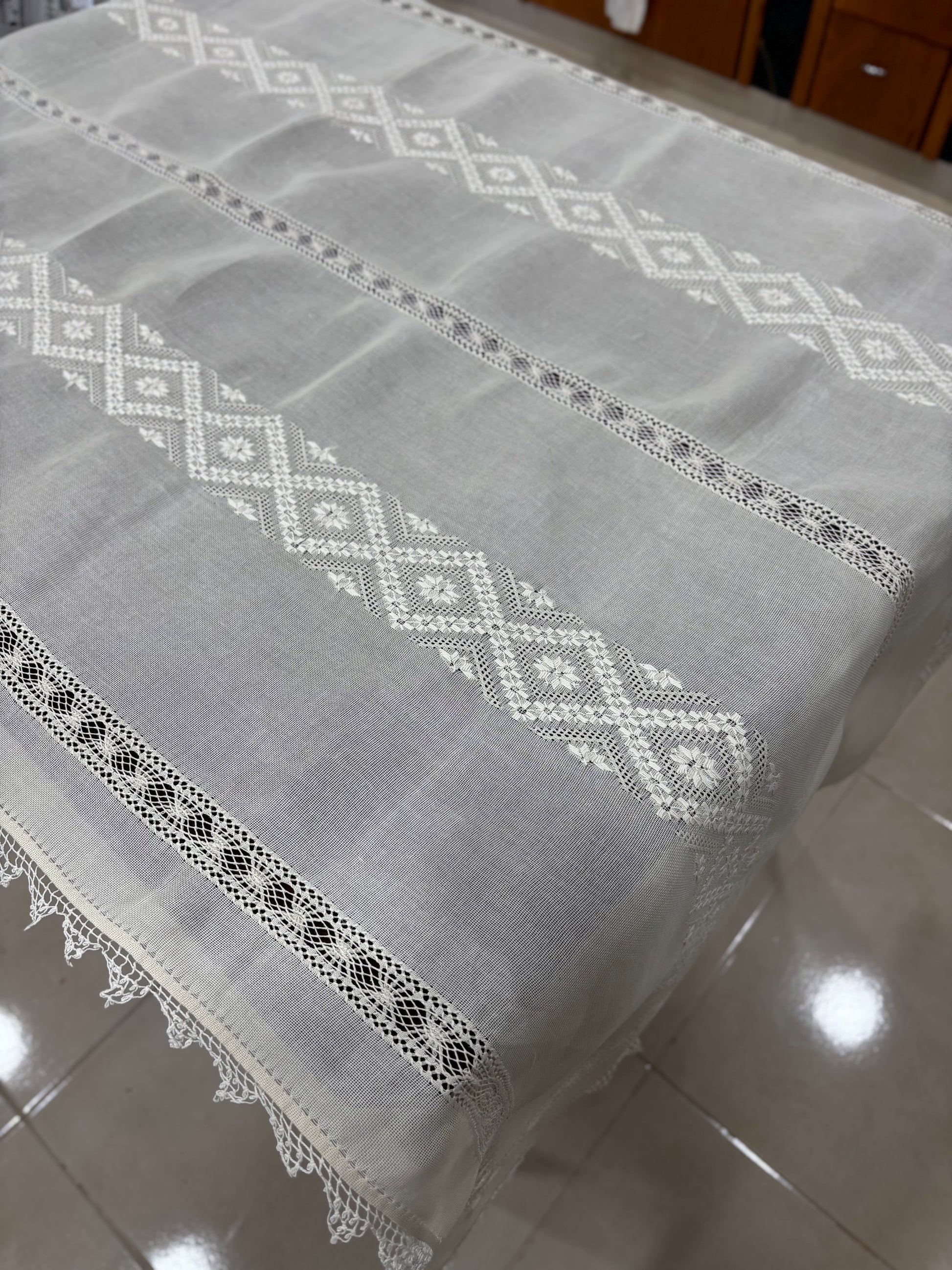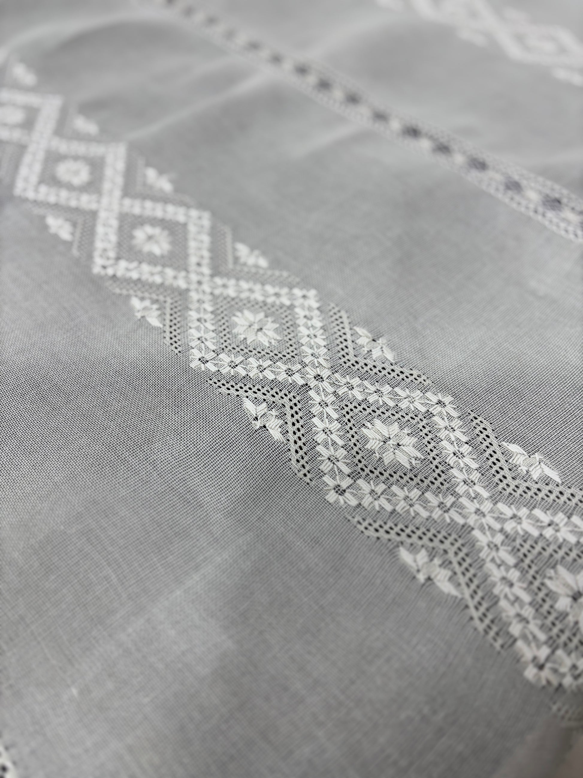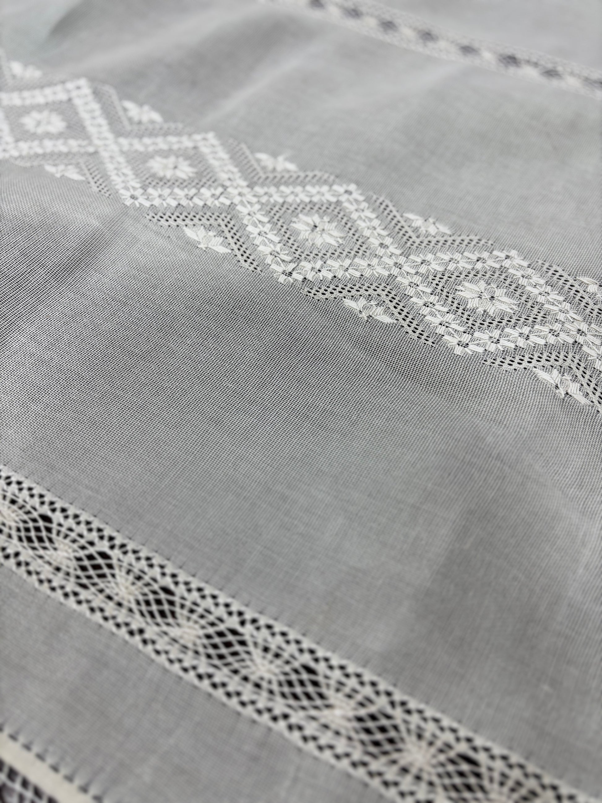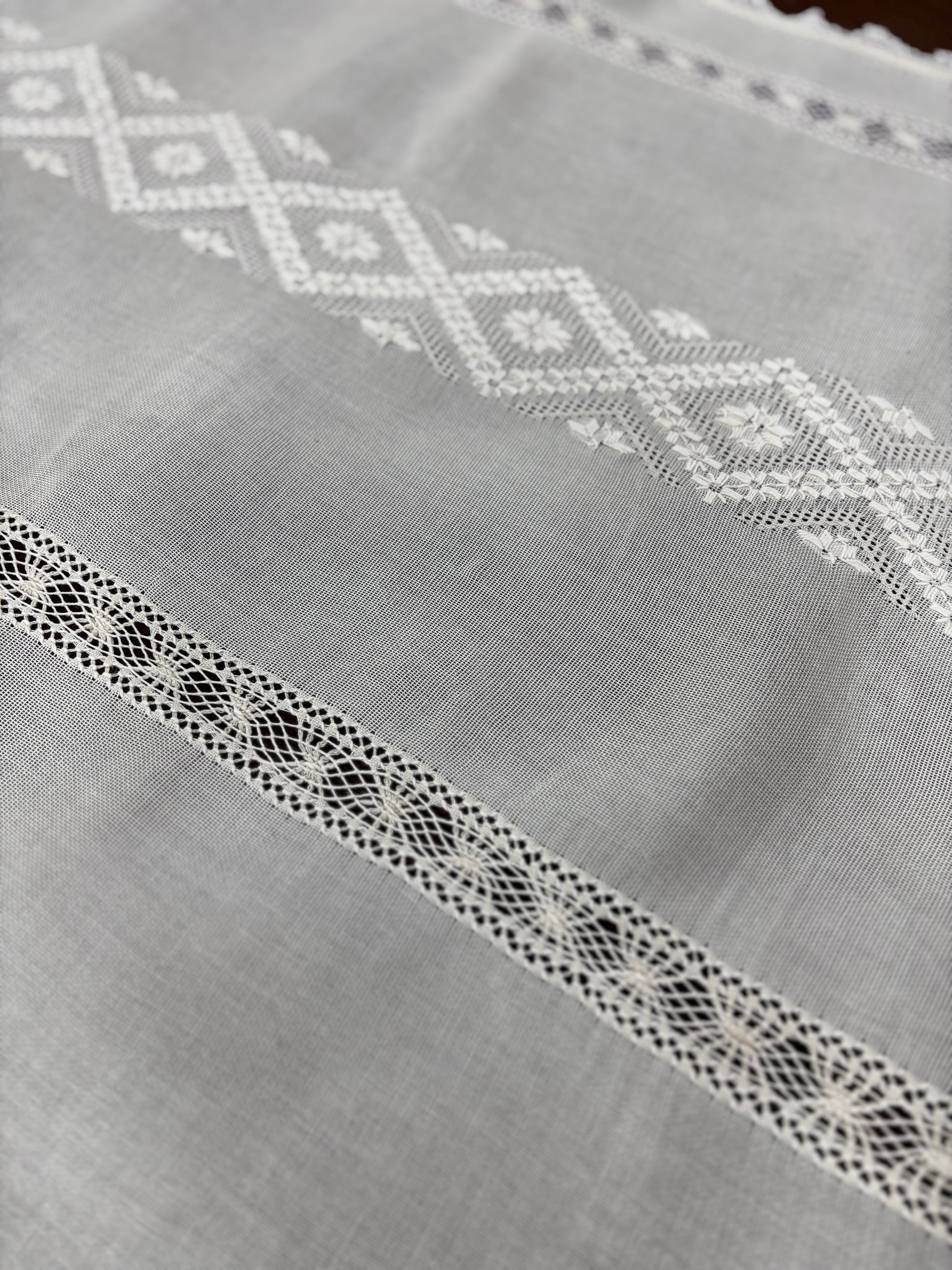 イスポイトゥという糸を抜いた後に模様を入れていく技法をふんだんに使ったテーブルランナーです。